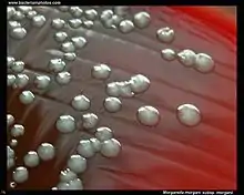 Morganella morganii is a species of Gram-negative bacteria.[2] It has a commensal relationship within the intestinal tracts of humans, mammals, and reptiles as normal flora.[2] Although M. morganii has a wide distribution, it is considered an uncommon cause of community-acquired infection, and it is most often encountered in postoperative and other nosocomial infections, such as urinary tract infections.[3]