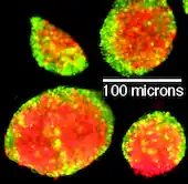 At a tissue level, ignoring the means of control, morphogenesis arises because of cellular proliferation and motility.[9] Morphogenesis also involves changes in the cellular structure[10] or how cells interact in tissues. These changes can result in tissue elongation, thinning, folding, invasion or separation of one tissue into distinct layers. The latter case is often referred as cell sorting. Cell "sorting out" consists of cells moving so as to sort into clusters that maximize contact between cells of the same type. The ability of cells to do this has been proposed to arise from differential cell adhesion by Malcolm Steinberg through his differential adhesion hypothesis. Tissue separation can also occur via more dramatic cellular differentiation events during which epithelial cells become mesenchymal (see Epithelial–mesenchymal transition). Mesenchymal cells typically leave the epithelial tissue as a consequence of changes in cell adhesive and contractile properties. Following epithelial-mesenchymal transition, cells can migrate away from an epithelium and then associate with other similar cells in a new location.[11] In plants, cellular morphogenesis is tightly linked to the chemical composition and the mechanical properties of the cell wall. [12][13]