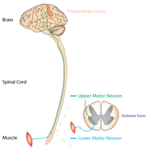 UMNs are motor neurons that project from the cortex down to the brainstem or spinal cord.[18] LMNs originate in the anterior horns of the spinal cord and synapse on peripheral muscles.[18] Both motor neurons are necessary for the strong contraction of a muscle, but damage to an UMN can be distinguished from damage to a LMN by physical exam.[19]