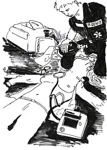 Mouth-to-mouth resuscitation, a form of artificial ventilation, is the act of assisting or stimulating respiration in which a rescuer presses their mouth against that of the victim and blows air into the person's lungs.[1][2] Artificial respiration takes many forms, but generally entails providing air for a person who is not breathing or is not making sufficient respiratory effort on their own.[3] It is used on a patient with a beating heart or as part of cardiopulmonary resuscitation (CPR) to achieve the internal respiration.