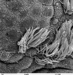 ![]() Ciliated epithelium in bronchus with short microvilli on non-ciliated cells | |
