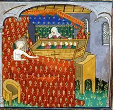 In certain medieval European chivalric romances, such as Marie de France's Le Fresne, a woman cites a multiple birth (often to a lower-class woman) as proof of adultery on her part; while this may reflect a widespread belief, it is invariably treated as malicious slander, to be justly punished by the accuser having a multiple birth of her own, and the events of the romance are triggered by her attempt to hide one or more of the children.[61] A similar effect occurs in the Knight of the Swan romance, in the Beatrix variants of the Swan-Children; her taunt is punished by giving birth to seven children at once, and her wicked mother-in-law returns her taunt before exposing the children.[62]