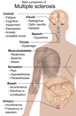 Multiple sclerosis can cause a variety of symptoms: changes in sensation (hypoesthesia), muscle weakness, abnormal muscle spasms, or difficulty moving; difficulties with coordination and balance; problems in speech (dysarthria) or swallowing (dysphagia), visual problems (nystagmus, optic neuritis, phosphenes or diplopia), fatigue and acute or chronic pain syndromes, bladder and bowel difficulties, cognitive impairment, or emotional symptomatology (mainly major depression). The main clinical measure in progression of the disability and severity of the symptoms is the Expanded Disability Status Scale or EDSS.[1]