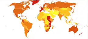 Most workplace MSD episodes involve multiple parts of the body.[33] MSDs are the most frequent health complaint by European, United States and Asian Pacific workers.[34] and the third leading reason for disability and early retirement in the U.S.[13] The incidence rate for MSDs among the working population in 2014 was 31.9 newly diagnosed MSDs per 10,000 full-time workers.[35] In 2014, the median days away from work due to MSDs was 13, and there were 10.4 cases per 10,000 full-time workers in which an MSD caused a worker to be away from work for 31 or more days.[35] MSDs are widespread in many occupations, including those with heavy biomechanical load like construction and factory work, and those with lighter loads like office work.[13] The transportation and warehousing industries have the highest incidence rate of musculoskeletal disorders, with an incidence rate of 89.9 cases per 10,000 full-time workers.[35] Healthcare, manufacturing, agriculture, wholesale trade, retail, and recreation industries all have incidence rates above 35 per 10,000 full-time workers.[35] For example, a national survey of U.S. nurses found that 38% reported an MSD in the prior year, mainly lower back injury.[36] The neck and back are the most common sites of MSDs in workers, followed by the upper limbs and lower limbs.[35] The Bureau of Labor Statistics reports that 31.8 new cases of MSDs per 10,000 full-time workers per year are due to overexertion, bodily reaction, or repetitive motions.[35]