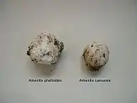 A majority of these cases are due to mistaken identity.[17] This is a common occurrence with A. phalloides in particular, due to its resemblance to the Asian paddy-straw mushroom, Volvariella volvacea. Both are light-colored and covered with a universal veil when young.