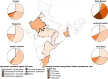 Mycetoma is endemic in some regions of the tropics and subtropics.[1] India, Sub-Saharan Africa as Sudan, and Mexico are most affected.[1][15] Pakistan is probably a moderate-endemic country.[8] Sporadic cases have been reported across some North African countries.[16] Egypt is probably a low-endemic country.[5]