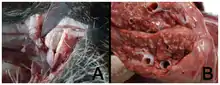 Bovine tuberculosis is a chronic infectious disease which affects a broad range of mammalian hosts, including humans, cattle, deer, llamas, pigs, domestic cats, wild carnivores (foxes, coyotes) and omnivores (common brushtail possum, mustelids and rodents); it rarely affects equids or sheep.[6][7] The disease can be transmitted in several ways; for example, it can be spread in exhaled air, sputum, urine, faeces, and pus, so the disease can be transmitted by direct contact, contact with the excreta of an infected animal, or inhalation of aerosols, depending on the species involved.[8]