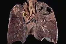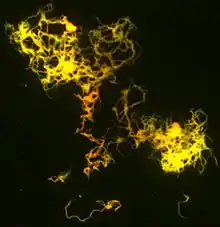 Other bacteria are commonly identified with a microscope by staining them with Gram stain. However, the mycolic acid in the cell wall of M. tuberculosis does not absorb the stain. Instead, acid-fast stains such as Ziehl–Neelsen stain, or fluorescent stains such as auramine are used.[4] Cells are curved rod-shaped and are often seen wrapped together, due to the presence of fatty acids in the cell wall that stick together.[12] This appearance is referred to as cording, like strands of cord that make up a rope.[9] M. tuberculosis is characterized in tissue by caseating granulomas containing Langhans giant cells, which have a "horseshoe" pattern of nuclei.