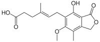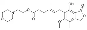 Mycophenolic acid is an immunosuppressant medication used to prevent rejection following organ transplantation and to treat autoimmune conditions such as Crohn's disease and lupus.[11][12] Specifically it is used following kidney, heart, and liver transplantation.[12] It can be given by mouth or by injection into a vein.[12] It comes as mycophenolate sodium and mycophenolate mofetil.[12]