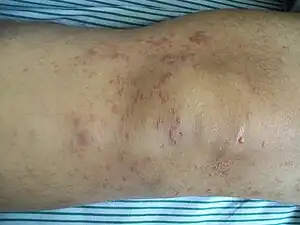The symptoms displayed are progressive, with early stages consisting of lesions presented as scaly patches. Lesions often initially develop on the trunk of the body in places that are rarely exposed to the sun, such as the buttocks.[5] These lesions can start as insignificant patches and may remain undiagnosed for up to a decade.[9] Hypopigmentation (when the skin is lighter than normal) of lesions are less common but can be found in children, adolescents and/or dark-skinned individuals.[10]