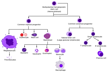 In hematopoiesis, myeloid or myelogenous cells are blood cells that arise from a progenitor cell for granulocytes, monocytes, erythrocytes, or platelets[1][2] (the common myeloid progenitor, that is, CMP or CFU-GEMM), or in a narrower sense also often used, specifically from the lineage of the myeloblast (the myelocytes, monocytes, and their daughter types). Thus, although all blood cells, even lymphocytes, are normally born in the bone marrow in adults, myeloid cells in the narrowest sense of the term can be distinguished from lymphoid cells, that is, lymphocytes, which come from common lymphoid progenitor cells that give rise to B cells and T cells.[2] Those cells' differentiation (that is, lymphopoiesis) is not complete until they migrate to lymphatic organs such as the spleen and thymus for programming by antigen challenge. Thus, among leukocytes, the term myeloid is associated with the innate immune system, in contrast to lymphoid, which is associated with the adaptive immune system. Similarly, myelogenous usually refers to nonlymphocytic white blood cells,[3] and erythroid can often be used to distinguish "erythrocyte-related" from that sense of myeloid and from lymphoid.[4]