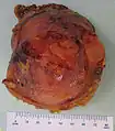 A macroscopic photograph of an adrenal myelolipoma. A remnant of the adrenal gland can be seen at the top