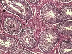 Histological section through testicular parenchyma of a boar. 1 Lumen of Tubulus seminiferus contortus, 2 spermatids, 3 spermatocytes, 4 spermatogonia, 5 Sertoli cell, 6 Myofibroblasts, 7 Leydig cells, 8 capillaries
