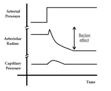 Bayliss effect or Bayliss myogenic response is a special manifestation of the myogenic tone in the vasculature.[2][3] The Bayliss effect in vascular smooth muscles cells is a response to stretch. This is especially relevant in arterioles of the body. When blood pressure is increased in the blood vessels and the blood vessels distend, they react with a constriction; this is the Bayliss effect. Stretch of the muscle membrane opens a stretch-activated ion channel. The cells then become depolarized and this results in a Ca2+ signal and triggers muscle contraction. It is important to understand that no action potential is necessary here; the level of entered calcium affects the level of contraction proportionally and causes tonic contraction. The contracted state of the smooth muscle depends on the grade of stretch and plays an important part in the regulation of blood flow.