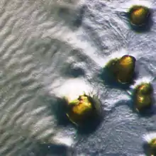 An important part of M. xanthus behavior is its ability to move on a solid surface by a mechanism called "gliding".[4] Gliding Motility is a method of locomotion that allows for movement, without the help of flagella, on a solid surface. Gliding Motility is also called A-motility (adventurous).[5] In A motility, single cells move, resulting in a distribution with many single cells. M. xanthus have the ability to use a second type of motility. This motility is called Social motility, single cells do not move, but cells that are close to one another move. This leads to a spatial distribution of cells with many clusters and few isolated single cells.[5] This motility depend on the presence of the Type IV pili[6] and diverse polysaccharides.[7][8]