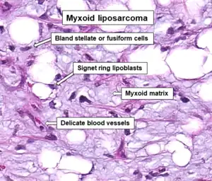 | Histopathologic image of myxoid liposarcoma arising in the thigh. H & E stain. | |