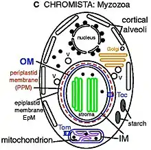 All Myzozoa appears to have evolved from an ancestor that possessed plastids, required through endosymbiosis.[9]