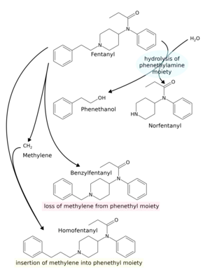 The modifications described here cover alterations to the ring structure donated by the fentanyl precursor 4-ANPP. Although another series covered substitutions of hydrogen atoms on the original carbon ring structure, sometimes called functional group additions, this series focuses on the three main modifications to the phenethyl moiety. The first modifications is the removal of the phenthyl moeity from the piperidinyl nitrogen, depicted here as hydrolysis yielding phenethanol. This changes the parent skeletal name to norfentanyl.