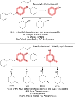 This procedure will be used when making an assessment of the number of valid stereoisomers that an analogue of fentanyl will be predicted to have. Because the analogues of fentanyl are so large, and the moieities (sub-regions) of the molecule that are relevant to its chirality are so small, that we often reproduce the fentanyl analogue as a smaller, simpler molecule with the same number of, and dynamics between its, stereocenters. This saves significant space allowing us not to reproduce redundant material that consumes a lot of space on the image.