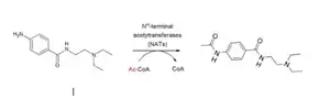 Procainamide is metabolized in the liver to acecainide by N-acetyltransferase, an enzyme that is genetically determined.[4] N-Acetyltransferase is an enzyme that catalyzes the transfer of acetyl groups from acetyl-CoA to arylamines and aromatic amines such as procainamide.[5]