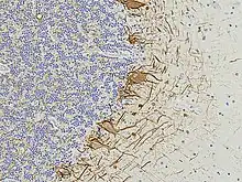 Neurofilament light polypeptide, also known as neurofilament light chain, abbreviated to NF-L or Nfl and with the HGNC name NEFL is a member of the intermediate filament protein family. This protein family consists of over 50 human proteins divided into 5 major classes, the Class I and II keratins, Class III vimentin, GFAP, desmin and the others, the Class IV neurofilaments and the Class V nuclear lamins. There are four major neurofilament subunits, NF-L, NF-M, NF-H and α-internexin. These form heteropolymers which assemble to produce 10nm neurofilaments which are only expressed in neurons where they are major structural proteins, particularly concentrated in large projection axons. Axons are particularly sensitive to mechanical and metabolic compromise and as a result axonal degeneration is a significant problem in many neurological disorders. The detection of neurofilament subunits in CSF and blood has therefore become widely used as a biomarker of ongoing axonal compromise. The NF-L protein is encoded by the NEFL gene.[5][6] Neurofilament light chain is a biomarker that can be measured with immunoassays in cerebrospinal fluid and plasma and reflects axonal damage in a wide variety of neurological disorders.[7][8] It is a useful marker for disease monitoring in amyotrophic lateral sclerosis,[9] multiple sclerosis,[10] Alzheimer's disease,[11][12] and more recently Huntington's disease.[13] It is also promising marker for follow-up of patients with brain tumors.[14] Higher levels of blood or CSF NF-L have been associated with increased mortality, as would be expected as release of this protein reflects ongoing axonal loss.[15] Recent work performed as a collaboration between EnCor Biotechnology Inc. and the University of Florida showed that the NF-L antibodies employed in the most widely used NF-L assays are specific for cleaved forms of NF-L generated by proteolysis induced by cell death. [16]