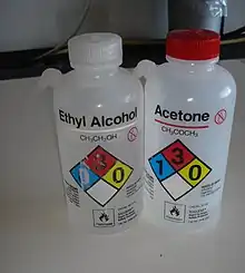 | 3 | Liquids and solids (including finely divided suspended solids) that can be ignited under almost all ambient temperature conditions (e.g. acetone, ethanol). Liquids having a flash point below 22.8 °C (73 °F) and having a boiling point at or above 37.8 °C (100 °F) or having a flash point between 22.8 and 37.8 °C (73 and 100 °F). |