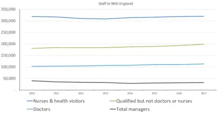 In the year ending at March 2017, there were 1.187 million staff in England's NHS, 1.9% more than in March 2016.[22] There were 34,260 unfilled nursing and midwifery posts in England by September 2017, this was the highest level since records began.[23] 23% of women giving birth were left alone part of the time causing anxiety to the women and possible danger to them and their babies. This is because there are too few midwives.[24] Neonatal mortality rose from 2.6 deaths for every 1,000 births in 2015 to 2.7 deaths per 1,000 births in 2016. Infant mortality (deaths during the first year of life) rose from 3.7 to 3.8 per 1,000 live births during the same period.[25] Assaults on NHS staff have increased, there were 56,435 recorded physical assaults on staff in 2016–2017, 9.7% more than the 51,447 the year before. Low staffing levels and delays in patients being treated are blamed for this.[26]