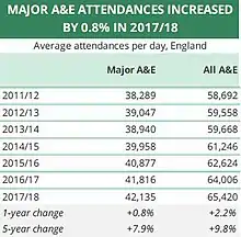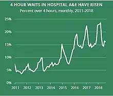 By December 2014, the number of patients being treated within four hours had fallen to 91.8%.[33] From December 2015, the 95% target over England as a whole was missed every month. From October–December 2016, only 4 out of 139 hospitals with major type 1 A&E departments met the target.[34] In November 2018, the British Medical Association reported that performance on emergency admissions, trolley waits for more than four hours and A&E patients seen within four hours in the summer of 2017 was worse than in the winters of 2011–15.[35] Performance against the four-hour wait target in the summer of 2018 was the worst second quarter performance recorded. Only 88.9% of patients were seen within four hours in September. The number of people admitted, transferred or discharged within four hours in emergency departments in September was up more than 3% compared to September 2017 with a 7% rise in emergency admissions said by John Appleby to be astonishing.[36] Attendance at A&E departments has been increasingly steadily for many years, more so at ‘type 3’ departments, like urgent care centres (where waiting times are generally lower). In the first eight months of 2018, an average of 67,000 people attended each day.[37] In January 2019, only 84.4% of patients were seen within four hours, the worst figure since the target was introduced in 2004.[38] In November 2019 not a single A&E department hit the four-hour wait time target.[39]