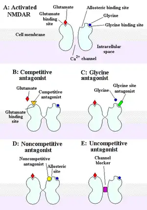Chemicals that deactivate the NMDA receptor are called antagonists. NMDAR antagonists fall into four categories: Competitive antagonists blocks, binding to neurotransmitter glutamate sites; glycine antagonists blocks, binding to glycine sites; noncompetitive antagonists inhibits, binding to NMDARs allosteric sites; and uncompetitive antagonists blocks, binding to a site within the ion channel.[10]