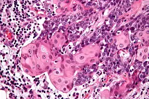 | Micrograph of a NUT carcinoma with the characteristic well-differentiated islands of squamous epithelium. H&E stain. | |