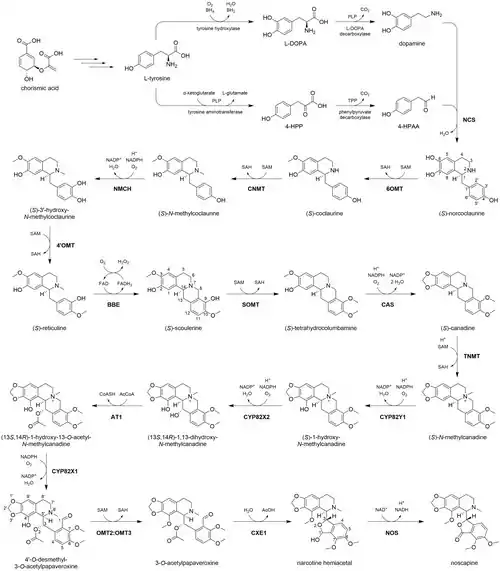 - Singh A, Menéndez-Perdomo IM, Facchini PJ (2019). "Benzylisoquinoline alkaloid biosynthesis in opium poppy: an update". Phytochemistry Reviews. 18 (6): 1457–1482. Bibcode:2019PChRv..18.1457S. doi:10.1007/s11101-019-09644-w. S2CID 208301912.