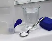 The water should not be tap water, which may contain small amounts of bacteria that are safe to drink but may be dangerous in the nose. The water should be sterile or filtered for micro-organisms; if tap water is used it should be boiled and cooled.[4] Saline solution is also sometimes used.[2]