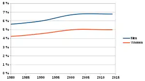 A study conducted by the International Diabetes Institute at Monash University showed that Asians, Pacific Islanders, and Middle Eastern immigrants who moved to Australia were diagnosed with diabetes at a higher level than the average.[10] The increase was explained by the adoption of a Western diet in place of a more healthy "traditional" diet more common in their native countries, as well as adopting a more sedentary lifestyle which is ubiquitous in developed countries.[11]