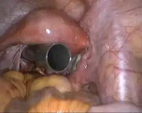 Endoscopic surgery trocar inserted through the vaginal fornix. The uterus is visible directly above the trocar.