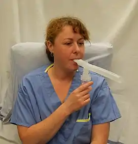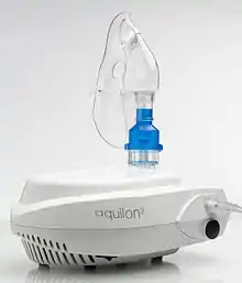 In medicine, a nebulizer (American English)[1] or nebuliser (British English)[2] is a drug delivery device used to administer medication in the form of a mist inhaled into the lungs. Nebulizers are commonly used for the treatment of asthma, cystic fibrosis, COPD and other respiratory diseases or disorders. They use oxygen, compressed air or ultrasonic power to break up solutions and suspensions into small aerosol droplets that are inhaled from the mouthpiece of the device. An aerosol is a mixture of gas and solid or liquid particles.