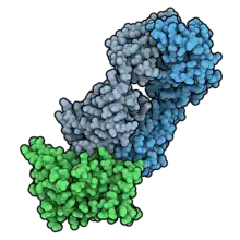 Necitumumab (INN) is a recombinant human IgG1 monoclonal antibody used as an antineoplastic, which is manufactured by Eli Lilly. It binds to the epidermal growth factor receptor (EGFR).[1] The US FDA approved necitumumab under the brand name Portrazza for use with gemcitabine and cisplatin in previously untreated metastatic squamous non-small-cell lung carcinoma (NSCLC).[2][3][4] It was counterproductive in non-squamous non-small-cell lung carcinoma.[4][5]