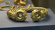 Of the two most notable types, one is the torc, an often heavy and valuable ornament normally open at the throat. These were worn by various early cultures but are especially associated with the ancient Celts of the European Iron Age, where they were evidently a key indicator of wealth and status, mostly worn by men.