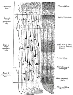 A representative column of neocortex. Cell body layers are labeled on the left, and fiber layers are labeled on the right.