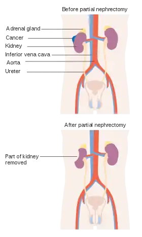 Partial nephrectomy offers the same chance of cure from the renal cell cancer as radical nephrectomy.[22][23] This was confirmed in a recent meta-analysis.[27] Partial nephrectomy has been shown to maintain kidney function better than total removal.[23] There is some debate whether this preservation of kidney function leads to long-term benefits to the patient.[28] Some studies have found that patients treated by partial nephrectomy live longer than patients who had their whole kidney removed.[23] Other studies have found the opposite.[29] Partial nephrectomy has been associated with better quality of life compared to radical nephrectomy.[30]