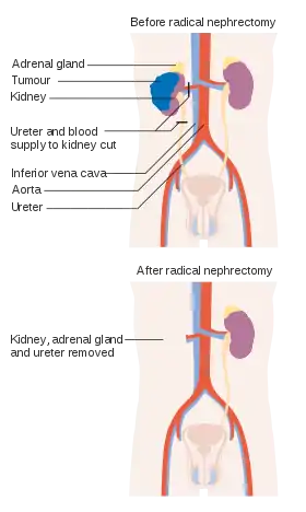 A total nephrectomy is the removal of at least the entire kidney, whereas a 'radical nephrectomy' also includes at least some perinephric fat, possibly including Gerota's fascia, and usually also the ipsilateral adrenal gland.[10]
