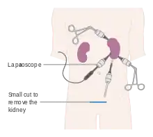 The surgery is performed with the patient under general anesthesia. A kidney can be removed through an open incision or by laparoscopic surgery. For the open procedure, the surgeon makes an incision in the side of the abdomen to reach the kidney. Depending on circumstances, the incision can also be made midline. The ureter and blood vessels are disconnected, and the kidney is then removed. The laparoscopic approach utilizes three or four small (5–10 mm) cuts in the abdominal and flank area. The kidney is completely detached inside the body and then placed in a bag. One of the incisions is then expanded to remove the kidney for cancer operations. If the kidney is being removed for other causes, it can be morcellated and removed through the small incisions. Recently, this procedure is performed through a single incision in the patient's navel. This advanced technique is called single port laparoscopy.