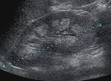 Nephrocalcinosis, once known as Albright's calcinosis after Fuller Albright, is a term originally used to describe the deposition of calcium salts in the renal parenchyma due to hyperparathyroidism. The term nephrocalcinosis is used to describe the deposition of both calcium oxalate and calcium phosphate.[1] It may cause acute kidney injury. It is now more commonly used to describe diffuse, fine, renal parenchymal calcification in radiology.[2] It is caused by multiple different conditions and is determined by progressive kidney dysfunction. These outlines eventually come together to form a dense mass.[3] During its early stages, nephrocalcinosis is visible on x-ray, and appears as a fine granular mottling over the renal outlines. It is most commonly seen as an incidental finding with medullary sponge kidney on an abdominal x-ray. It may be severe enough to cause (as well as be caused by) renal tubular acidosis or even end stage kidney disease, due to disruption of the kidney tissue by the deposited calcium.
