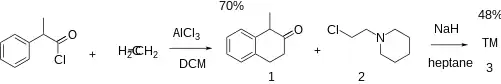 The starting material is called 2-Phenylpropanoyl Chloride [22414-26-2]. This is reacted with ethylene in the presence of aluminum trichloride catalyst to give 1-methyl-2-tetralone [66405-14-9] (1). Base catalyzed alkylation of this with 1-(2-chloroethyl)piperidine [1932-03-2] (2) gives Nepinalone (3).