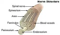 A nerve fascicle, is a bundle of nerve fibers belonging to a nerve in the peripheral nervous system.[1] A nerve fascicle is also called a fasciculus.[2] A nerve fascicle is enclosed by perineurium, a layer of fascial connective tissue.[3] Each enclosed nerve fiber in the fascicle is enclosed by a connective tissue layer of endoneurium. Bundles of nerve fascicles are called fasciculi and are constituents of a nerve trunk.[4][1][5] A main nerve trunk may contain a great many fascicles enclosing many thousands of axons.[5]