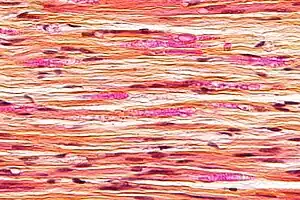 | Micrograph of a nerve with a decrease in myelinated nerve fibres (pink) and an abnormal increase in fibrous tissue (yellow), as may be seen in nerve injuries. HPS stain. | |