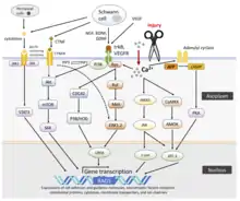 Immediately following injury, neurons undergo a large number of transcriptional and proteomic changes which switch the cell from a mature, synaptically active neuron to a synaptically silent, growth state. This process is dependent on new transcription, as blocking the ability of cells to transcribe new mRNA severely impairs regeneration. A number of signaling pathways have been shown to be turned on by axon injury and help to enable long distance regeneration including BMP, TGFβ, and MAPKs. Similarly, a growing number of transcription factors also boost the regenerative capacity of peripheral neurons including ASCL1, ATF3, CREB1, HIF1α, JUN, KLF6, KLF7, MYC, SMAD1, SMAD2, SMAD3, SOX11, SRF, STAT3, TP53, and XBP1. Several of these can also boost the regenerative capacity of CNS neurons, making them potential therapeutic targets for treating spinal cord injury and stroke.[4]