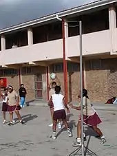 A version called High Five Netball is promoted by the All England Netball Association.[74] It is aimed at 9- to 11-year-old girls and includes only five positions.[74] The players swap positions during the game.[75] When a player is not on the court, she is expected to help the game in some other way, such as being the timekeeper or scorekeeper.[74] High Five Netball has four six-minute quarters.[74][75]