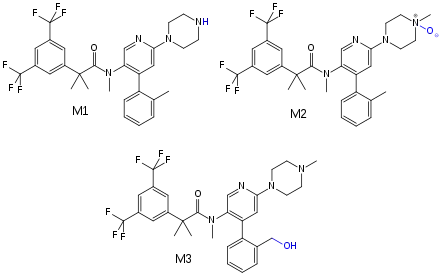 The substance is mainly metabolized by CYP3A4, and to a lesser extent by CYP2D6 and CYP2C9. The main metabolites are desmethyl-netupitant (M1), netupitant N-oxide (M2), and hydroxy-netupitant (M3); all three are pharmacologically active.[3][7]