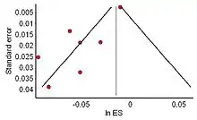 The distribution of effect sizes can be visualized with a funnel plot which (in its most common version) is a scatter plot of standard error versus the effect size. It makes use of the fact that the smaller studies (thus larger standard errors) have more scatter of the magnitude of effect (being less precise) while the larger studies have less scatter and form the tip of the funnel. If many negative studies were not published, the remaining positive studies give rise to a funnel plot in which the base is skewed to one side (asymmetry of the funnel plot). In contrast, when there is no publication bias, the effect of the smaller studies has no reason to be skewed to one side and so a symmetric funnel plot results. This also means that if no publication bias is present, there would be no relationship between standard error and effect size.[84] A negative or positive relation between standard error and effect size would imply that smaller studies that found effects in one direction only were more likely to be published and/or to be submitted for publication.