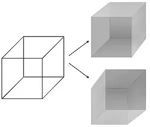 The Necker Cube: The left line drawing can be perceived in one of two distinct depth configurations shown on the right. Without any other cue, the visual system flips back and forth between these two interpretations.[14]